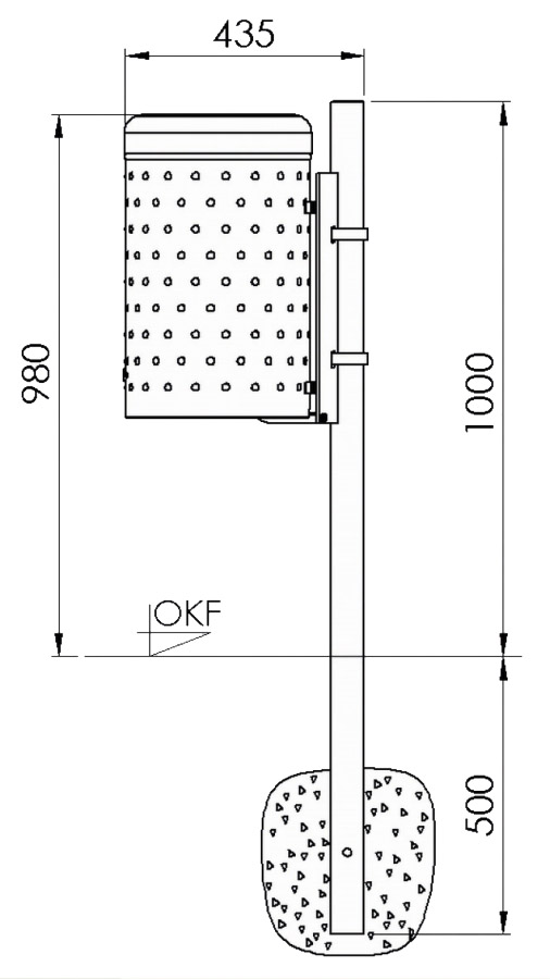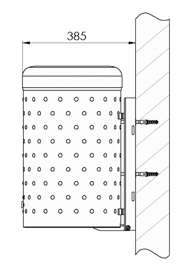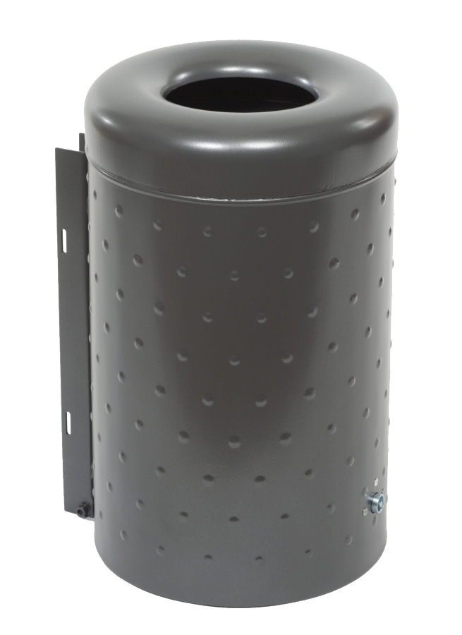 Abfallbehälter im attraktiven Noppenblech-Design, aus feuerverzinktem Stahlblech mit stabiler Deckelhaube. Wahlweise mit zusätzlicher Pulverbeschichtung. Der Abfallbehälter ist ausschließlich zur Wand- / Pfostenmontage geeignet und wird mit angeschweißter Befestigungsschiene geliefert.
