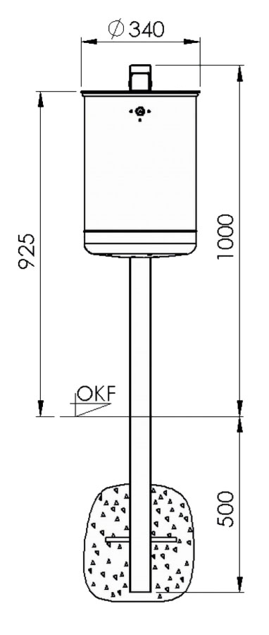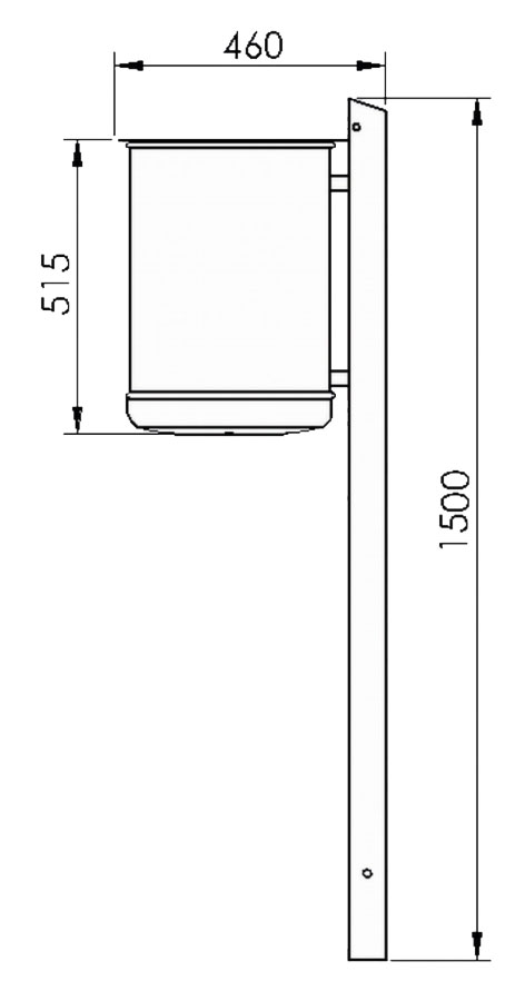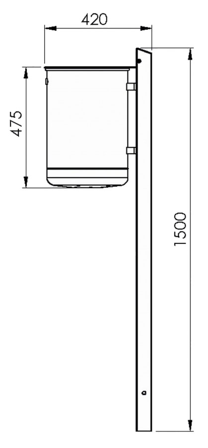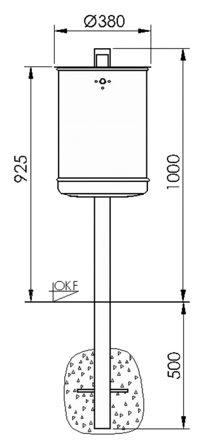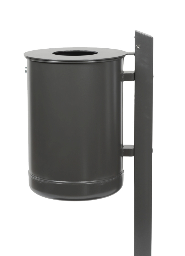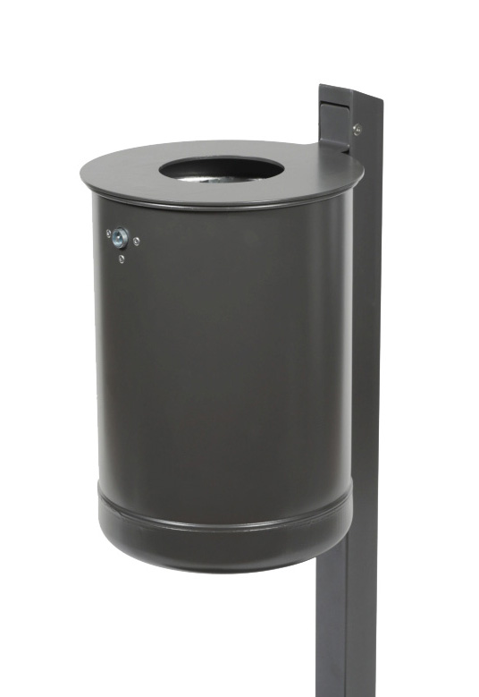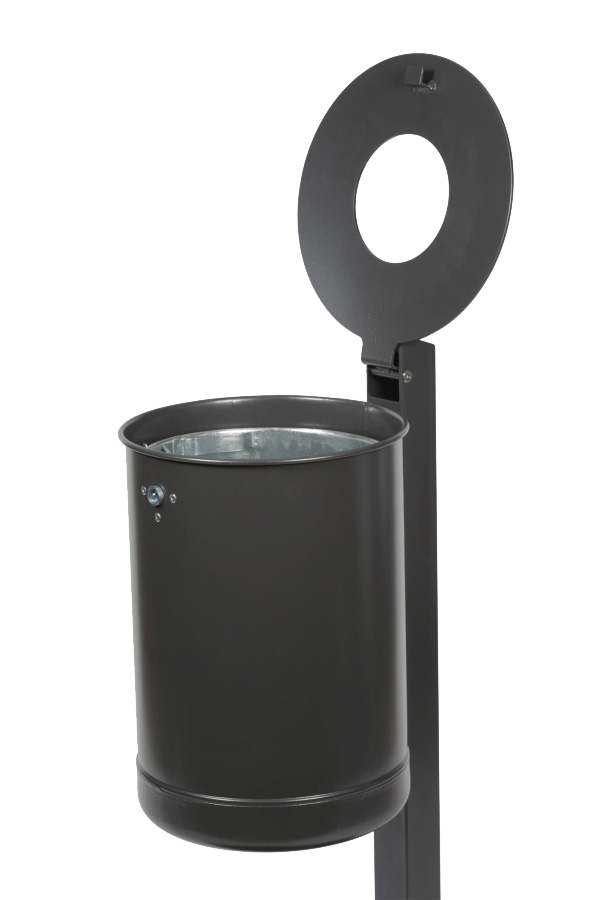 Abfallbehälter aus feuerverzinktem Stahlblech, wahlweise mit zusätzlicher Pulverbeschichtung. Der Abfallbehälter ist ausschließlich zur Pfostenmontage erhältlich und wird inkl. Quadratrohrpfosten und Dreikantschlüssel geliefert. Bei Beschädigung ermöglicht der Anschraubflansch den bequemen Wechsel des Abfallbehälters. Vandalismushemmende Deckelscheibe aus 4 mm Stahlblech.